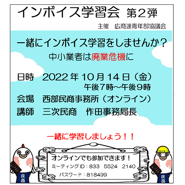 「営業動向調査2022」で収集したアンケートの分析結果を基に各自治体に中小業者の要望を提出することを提起。地方創生臨時交付金と合わせて進めていくことを確認し、来年10月に実施予定のインボイス制度についても、インボイス学習会の取り組みも、免税業者はもちろん、課税業者の会員さんからも不安が寄せられているため、10月後半から11月にかけて3回学習会を計画することを決定。会員さんや知り合いの自営業者にも知らせて多くの方に来て貰うよう、呼びかけを行うことを確認しました。