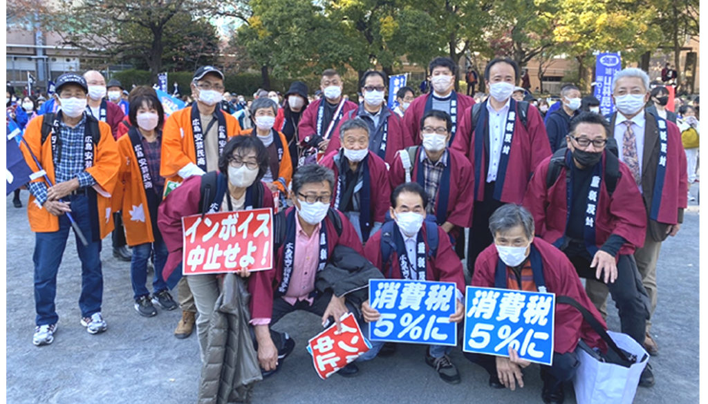 物価高騰対策、消費税減税とインボイス(適格請求書)制度中止を求め、マイナンバーカードの取得矯正に反対する大集会が東京芝公園で6日行われ、全国から900名、広島から21名、広島西部から坂井さんが参加し、デモ行進しました。